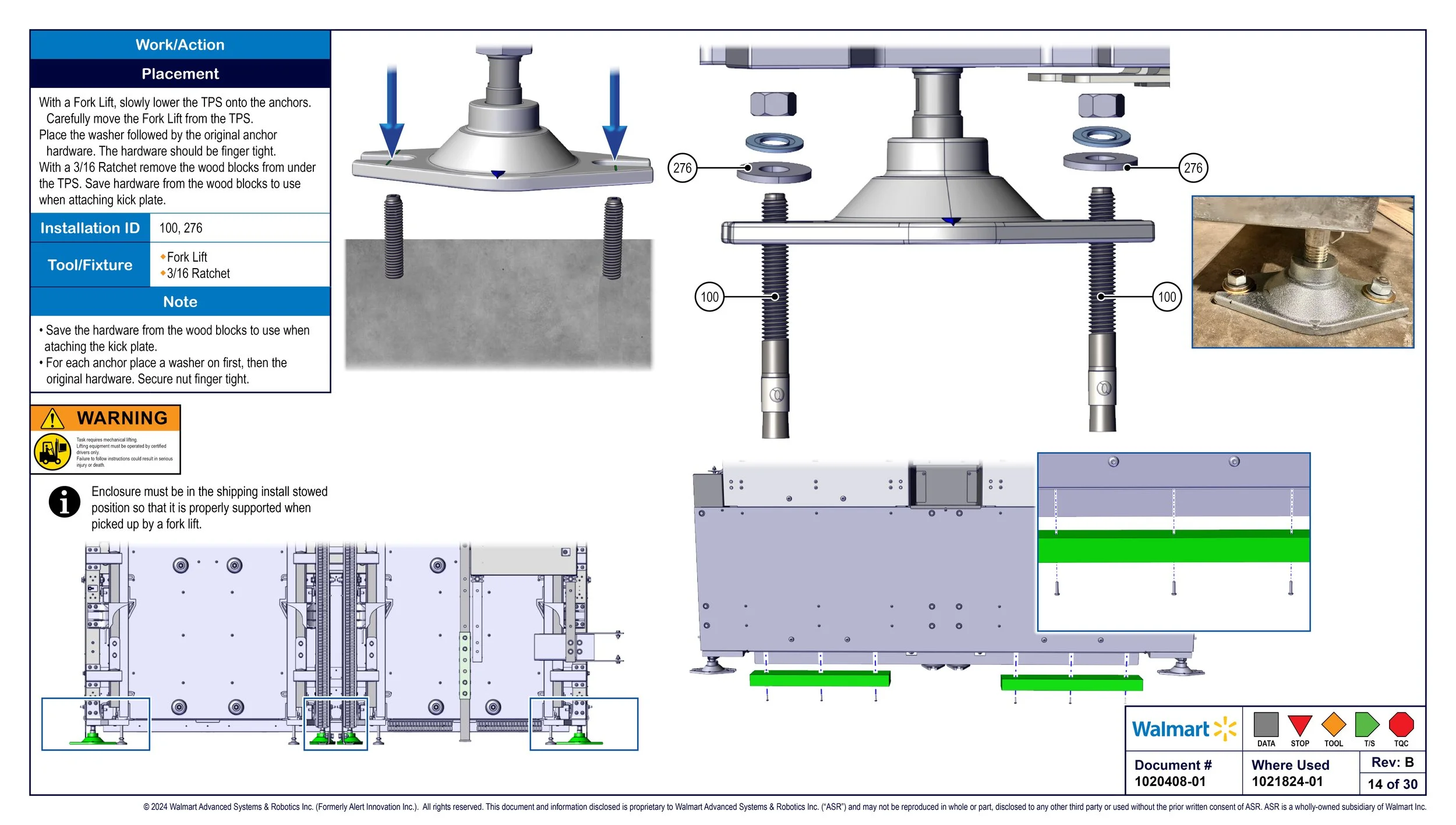 The development process began by collaborating with mechanical engineering SMEs to define the installation sequence. I then validated this process with the field installation team, incorporating any real-world deviations. After drafting the layout and graphics, I conducted redline reviews with SMEs and the safety team to ensure accuracy and compliance. Finalized documents were submitted to the PLM and integrated into the LMS for deployment.